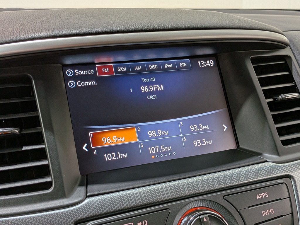 Radio: AM/FM/CD Audio System -inc: NissanConnect 8" colour display w/multi-touch control, voice recognition for audio, Bluetooth and vehicle information (includes music search by voice), SiriusXM Satellite Radio (3 months free trial), USB connection ports (2) for iPod interface and other compatible devices, Bluetooth Hands-free phone system, streaming audio via Bluetooth, Hands-free text messaging assistant, 12-volt DC power outlets (4) (2x IP, 1x console & 1x cargo) and 120V power outlet